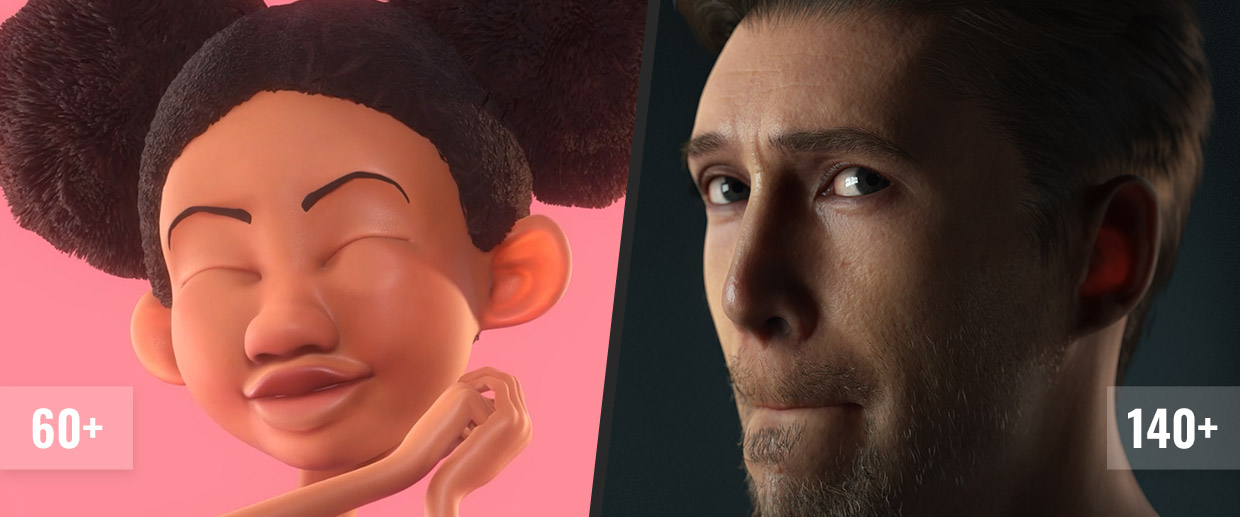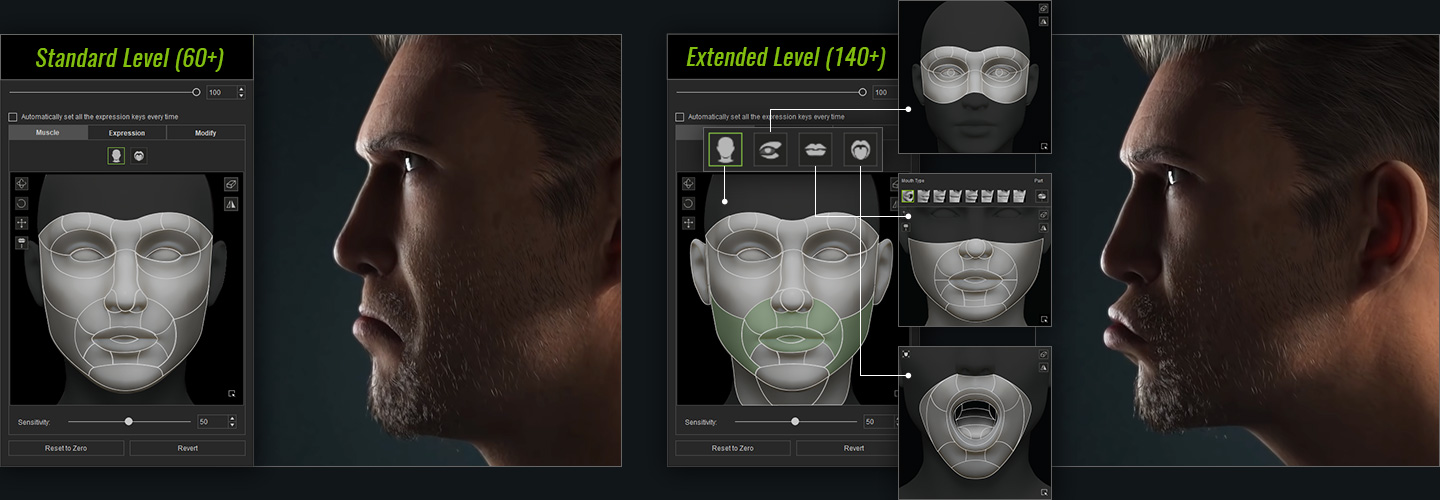 Through Morph Sliders, directly access 60+ Standard or 140+ Extended blendshapes. There are several unique values of using morphs sliders giving complete control over expression details; allowing input of extrapolated strength values (+/- 200 ); observe what blendshapes are being triggered through the Muscle Panel and Expression Presets. Furthermore, keyword search custom target morphs and actually see the blendshape names and values when exporting to external 3D tools.