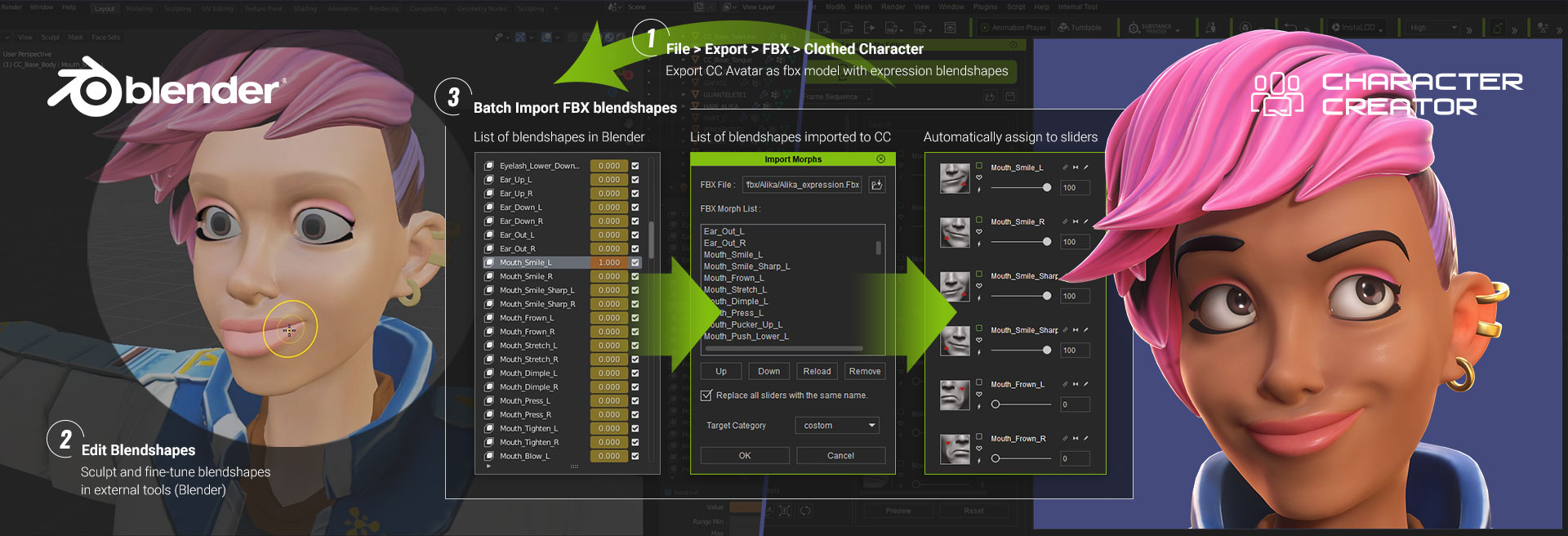 3D designers using Blender, Maya, or Max can batch update all edited morphs back to CC in one time. Since CC can export FBX characters with expression morphs, developers just need to fill in or modify those morph slots to get the custom result.