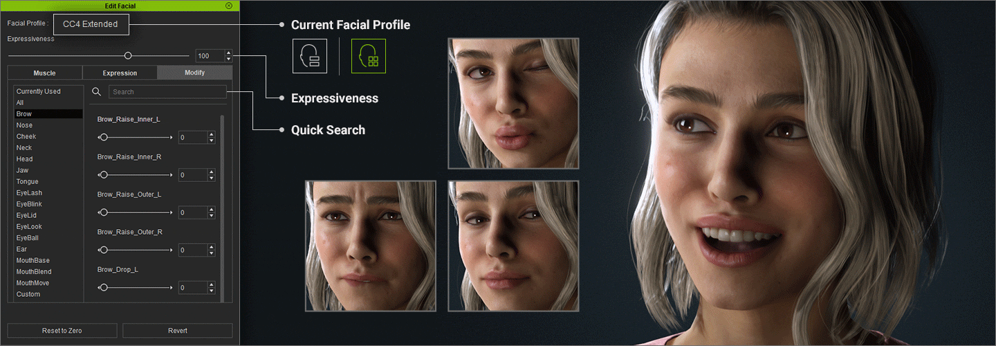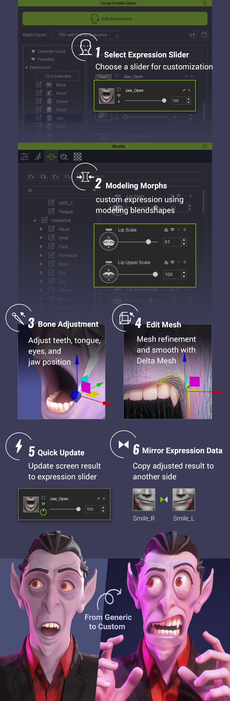 In the Expression Profile Editor, designers can browse through characters facial morph sliders, select and tweak a specific expression morph simply by blending with modeling morphs. There are more than 300 expression morphs provided in CC for designers' free expression adjustment. Other than morphs, the mesh and bone adjustment value can also be updated to the selected expression slider to form an unique shape.