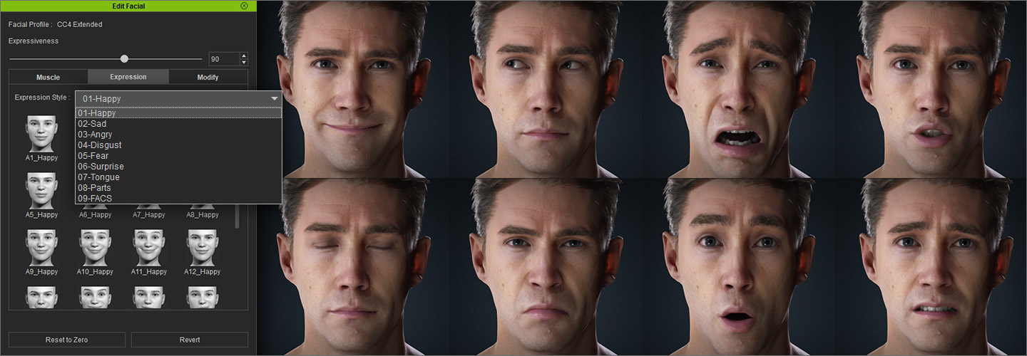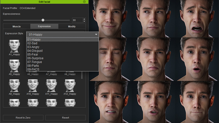 Professional character artists normally use an expression stylesheet as an animation reference to portray a character's personality. Character Creator gives all CC characters a set of generic expressions, and also allows character artists to fully make their custom expression settings.