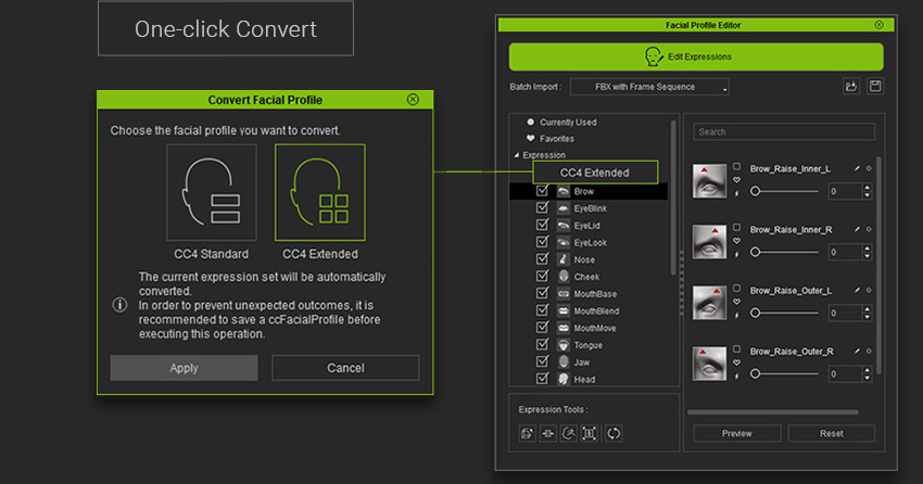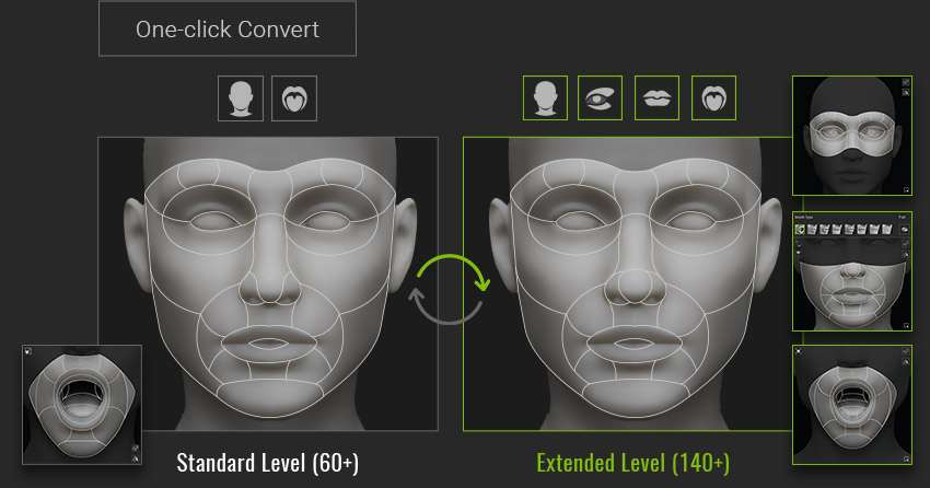 Character Creator's scalable expression system allows designers to easily upgrade or downgrade their actors' expression details when a certain level of export is required. Automatic morph merge and separation are supported for effortless facial profile conversion.