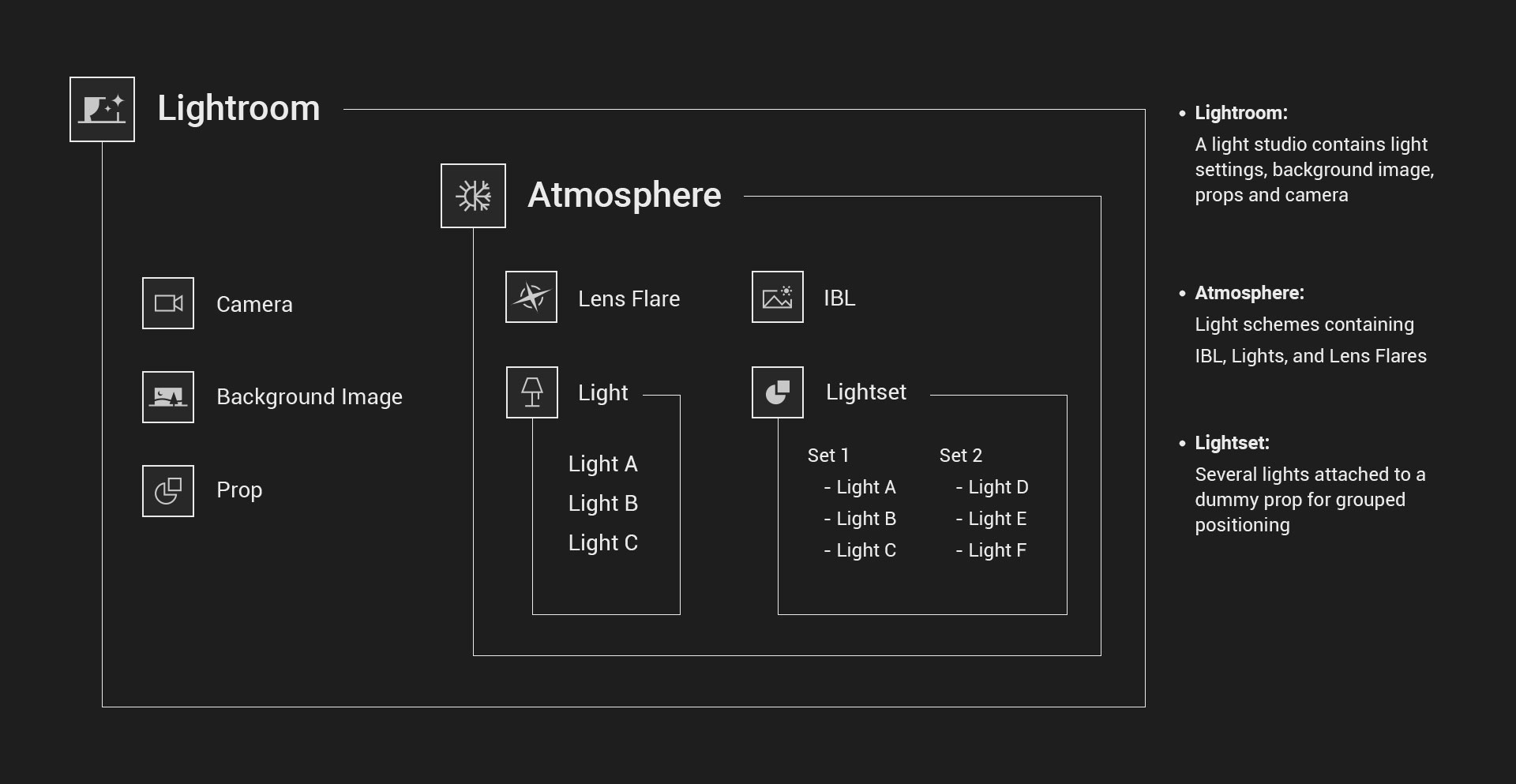 Atmosphere contains IBL, lights and lens flare, just drag and switch to a new light scheme; Lightroom is a superset format additionally with props, background image, and camera for specific pose or scene composition.