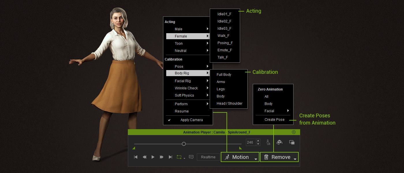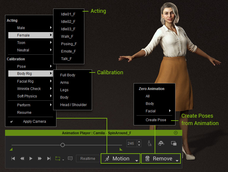 A full set of calibration motions help designers to check body and facial rigs, cloth physics settings, and custom lipsync quality. Learn More