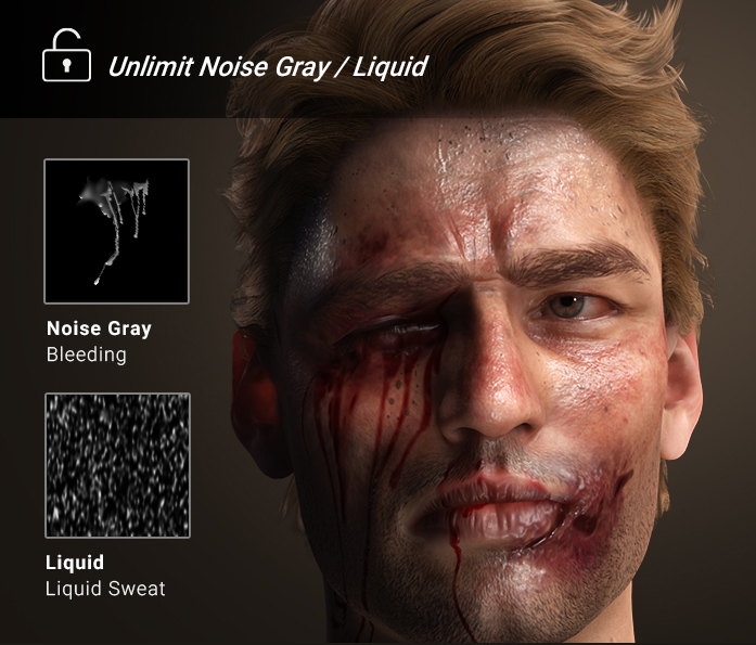Blemishes, tattoos, sweat and wounds are essential to many character designs. Apply image patterns in combination with imperfection tools to achieve the desired result.