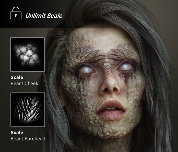 Import alpha patterns and define effective area with range masks. Let SkinGen tools propagate amazing skin effects with full controls over transformation and material details.