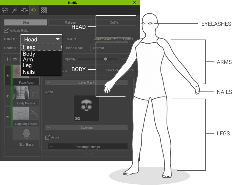 The skin is designed according to segments and follows the layering logic of real human skin from Skin Base to Body Hair. Through the intuitive workflow, apply and manage skin effects in every phase of the design process to achieve quality skin designs with a myriad of possible looks and styles.