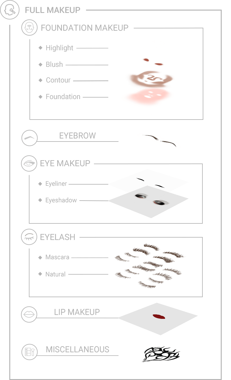 The makeup content types are designed based on practical cosmetic and effects makeup theory, from foundation, blush, to brows, eyes, eyelash, and lips . Makeup effects can be applied and editing at anytime during the design process.