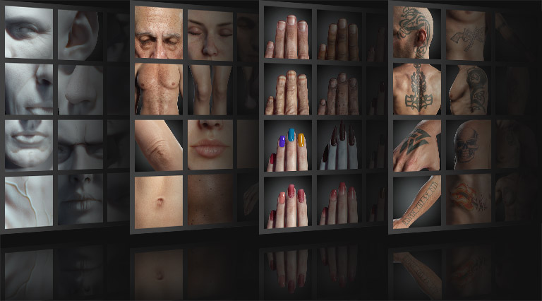 Access a whole new range of highly realistic, dynamic skin assets ranging from full-body skin presets to individual material effects. Customize the look with muscles, wrinkles, pores, color variation, scalp, body hair, nails, blemishes, and acne; overlay effects with acquired art from imported images for suntan, wounds, scars, tattoos and more.