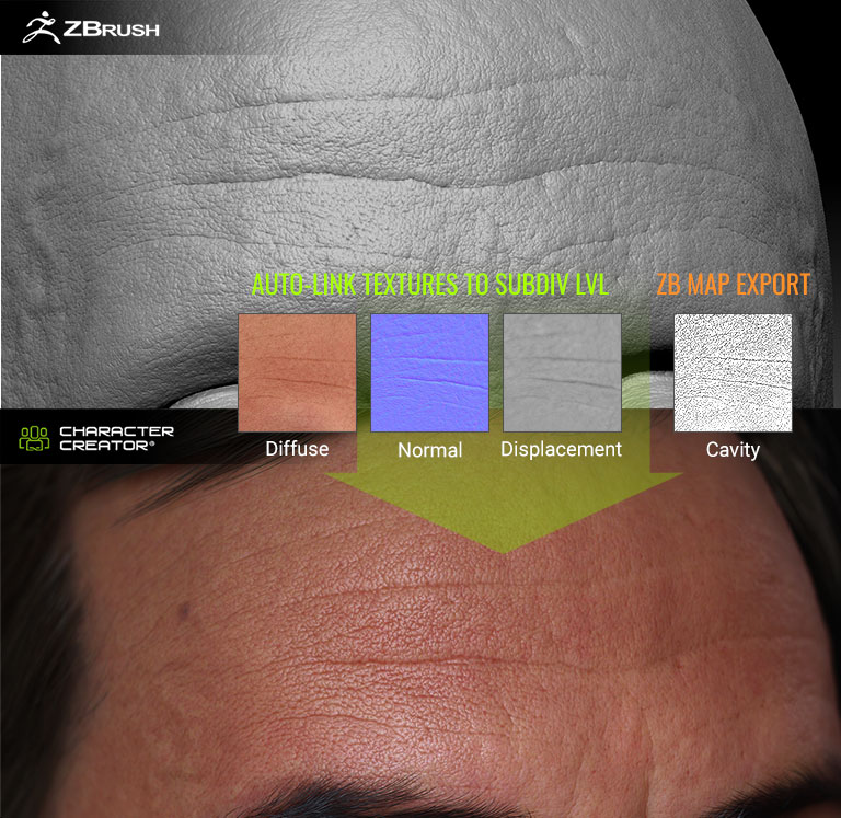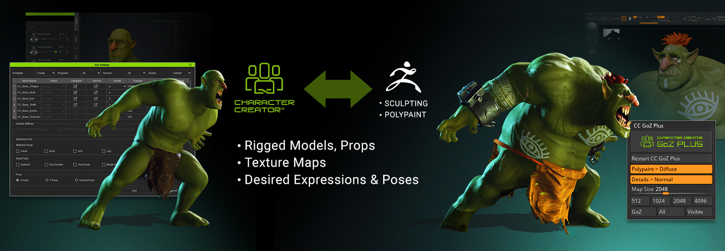 Sending CC Diffuse and Normal maps to ZBrush as polypaint and displacement is optional in GoZ. In ZBrush, diffuse and normal maps for Character Creator are managed using editable polypaint and displacement layers. Begin by importing the CC character into ZBrush, allowing for detailed sculpting and painting. Then, bake and transfer these changes back to Character Creator as an updated base figure with modified diffuse and normal maps. This adaptable two-way workflow empowers artists to enrich characters and integrate outcomes for dressing, accessorizing, and beyond.