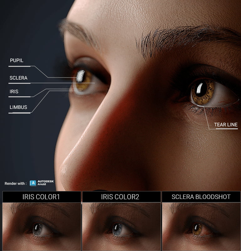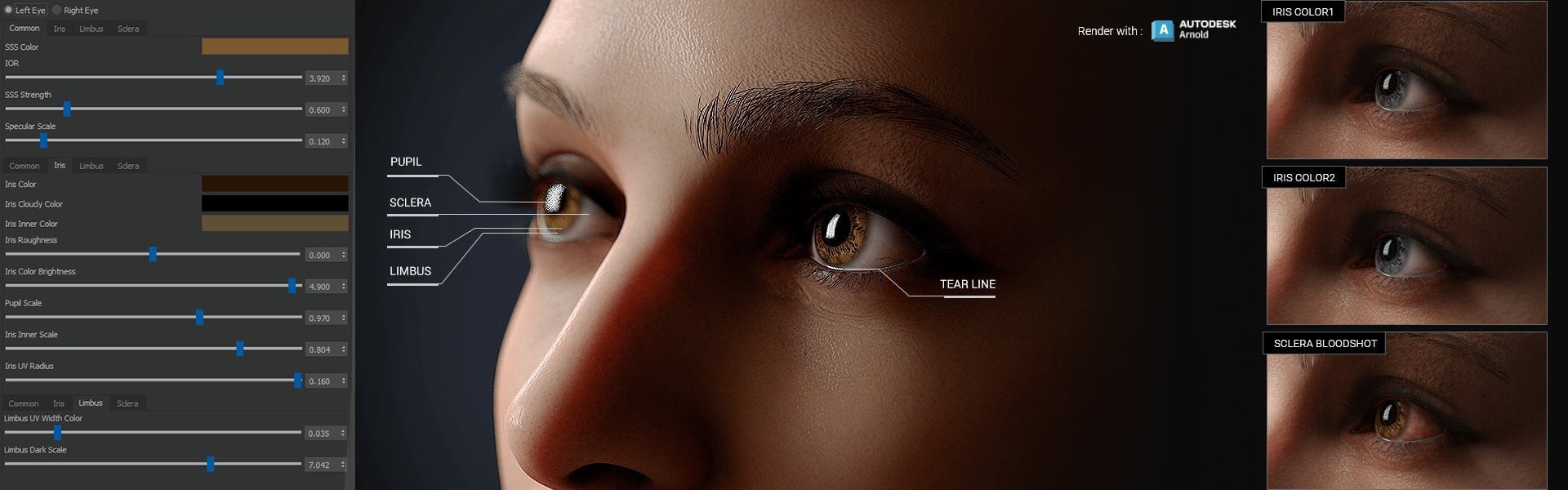 Auto Setup eye shader includes fully adjustable iris, sclera, limbus, and pupil components. Anatomical accuracy is represented with realistic roughness, depth, and refraction effects. Personalization is instilled with refined levels of coloring, brightness, and specularity.