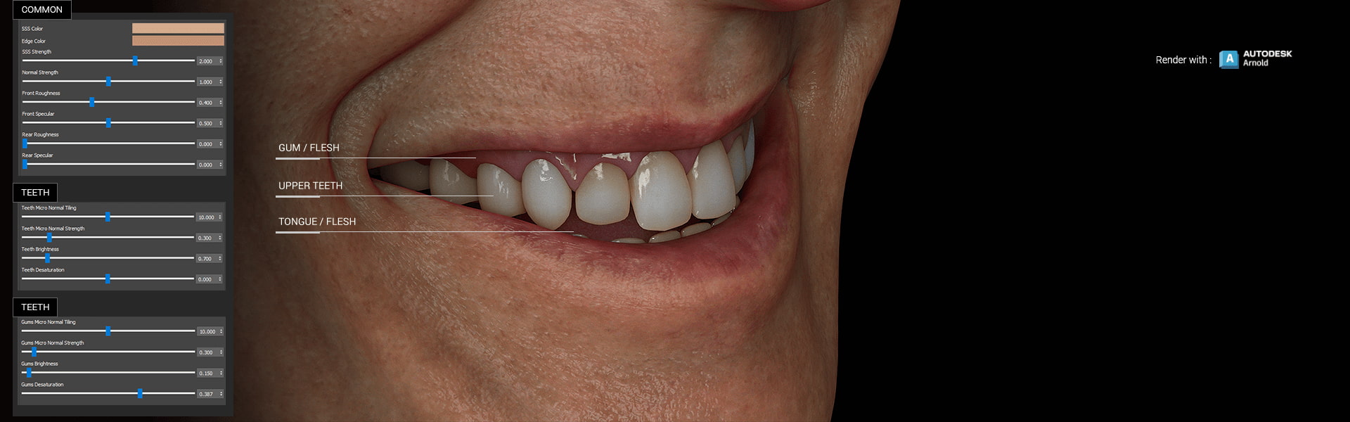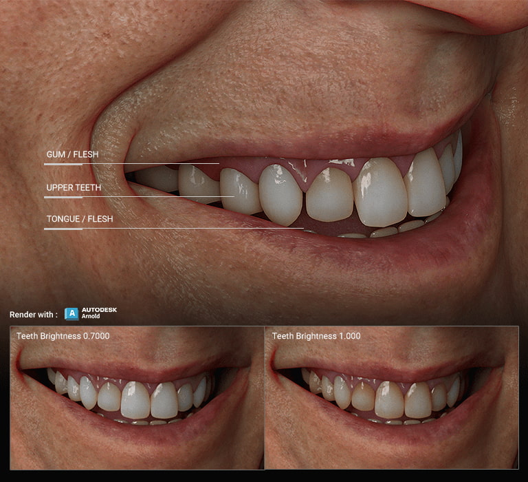 Teeth color and brightness can vary based on natural constitution, age, or health condition. Whether you need a radiant smile with neat and glistening teeth or a ferocious creature with intimidating fangs, the Teeth Shader can achieve any look. Shader effects can be combined with CC morph sliders to make teeth stand out with photorealistic rendering, and ambient occlusion can effectively darken the mouth cavity, adding depth and realistic shading.