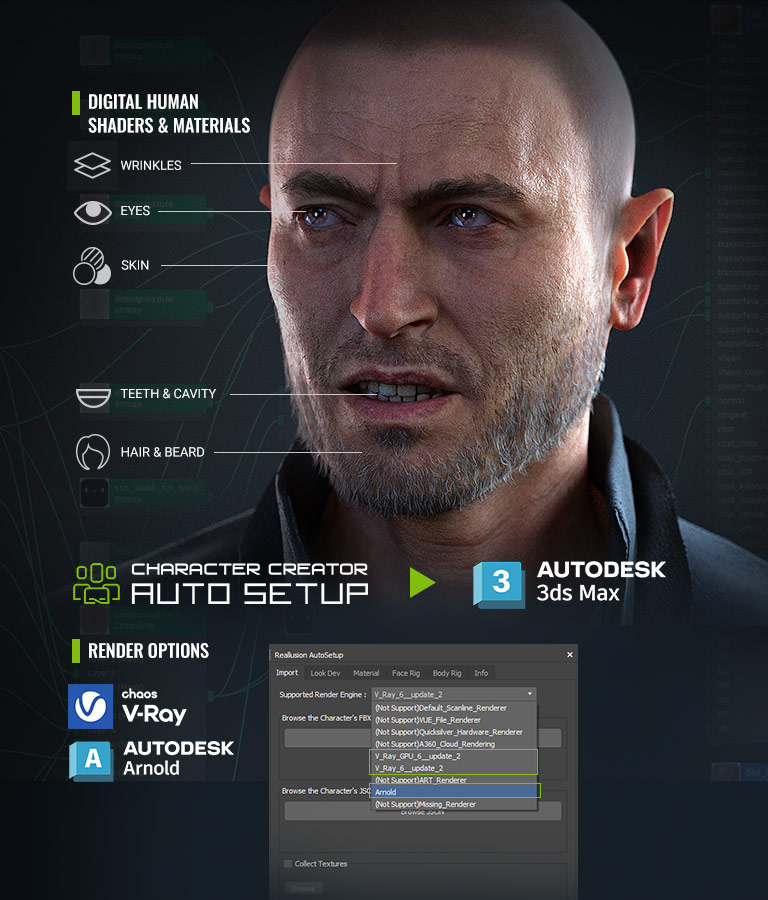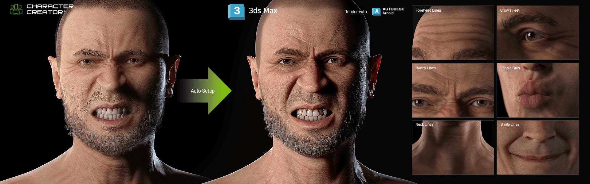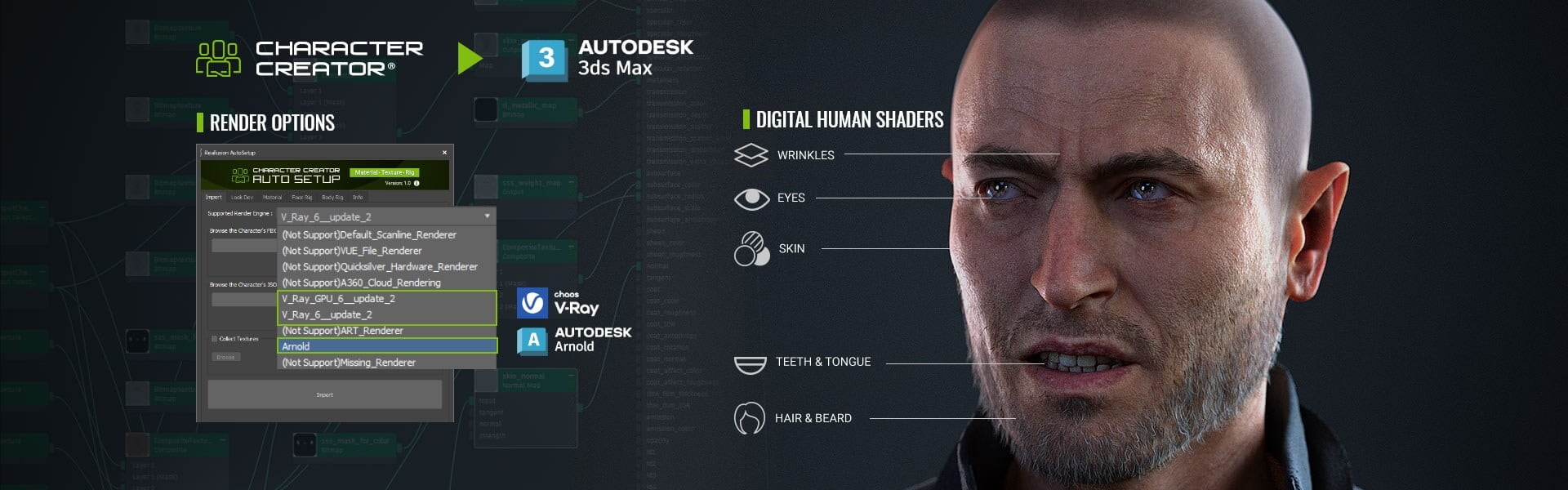 Fast-track your 3ds Max workflow with Reallusion Auto Setup. From designing characters and animating facial expressions to deploying crowd simulations, bypass the tedious construction of material graphs and skeletal rigging. Auto Setup also empowers the creation of realistic Arnold and V-Ray renders for high-definition characters from Character Creator, iClone and ActorCore.