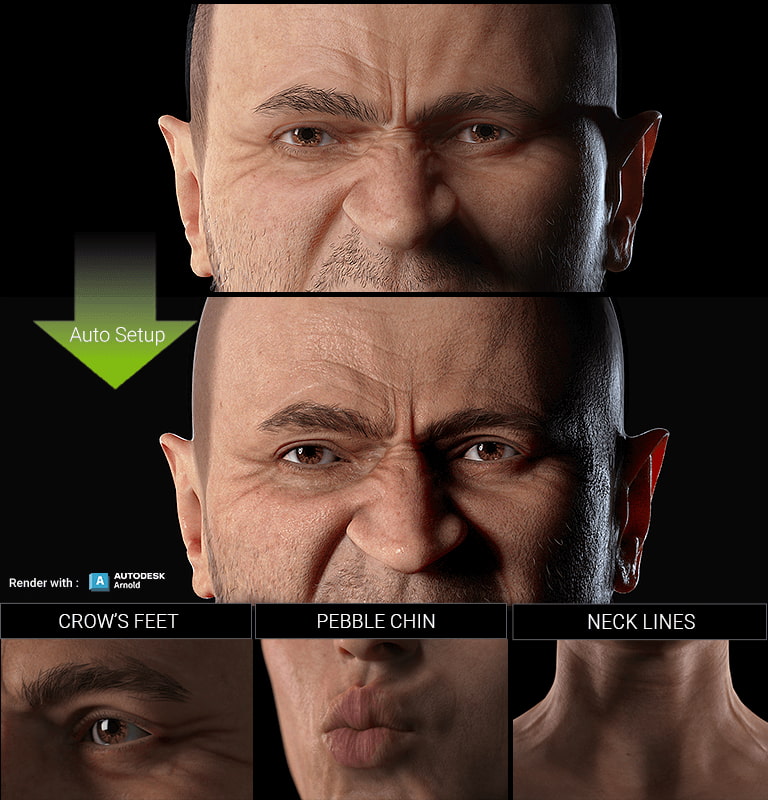 Auto Setup automatically converts the CC Digital Human Shader into Arnold and V-Ray material graphs for realistic ray-traced rendering. Easily tweak texture details for skin, eyes, hair, teeth, and tongue using the Auto Setup options panel.
