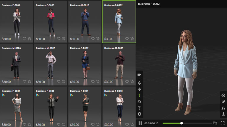 Professional light and camera setups ensure optimal character presentation. Five ready-to-use setups are available for close-up views and five for full shots, each adjustable to achieve the desired visual outcome, whether for high-quality main characters or low-poly crowd and extras.