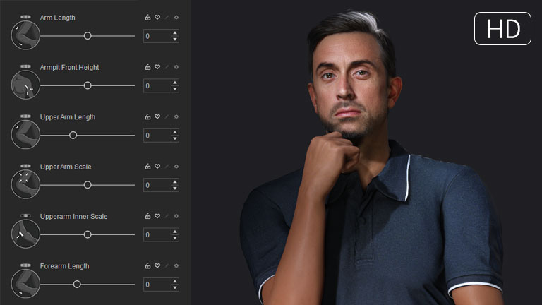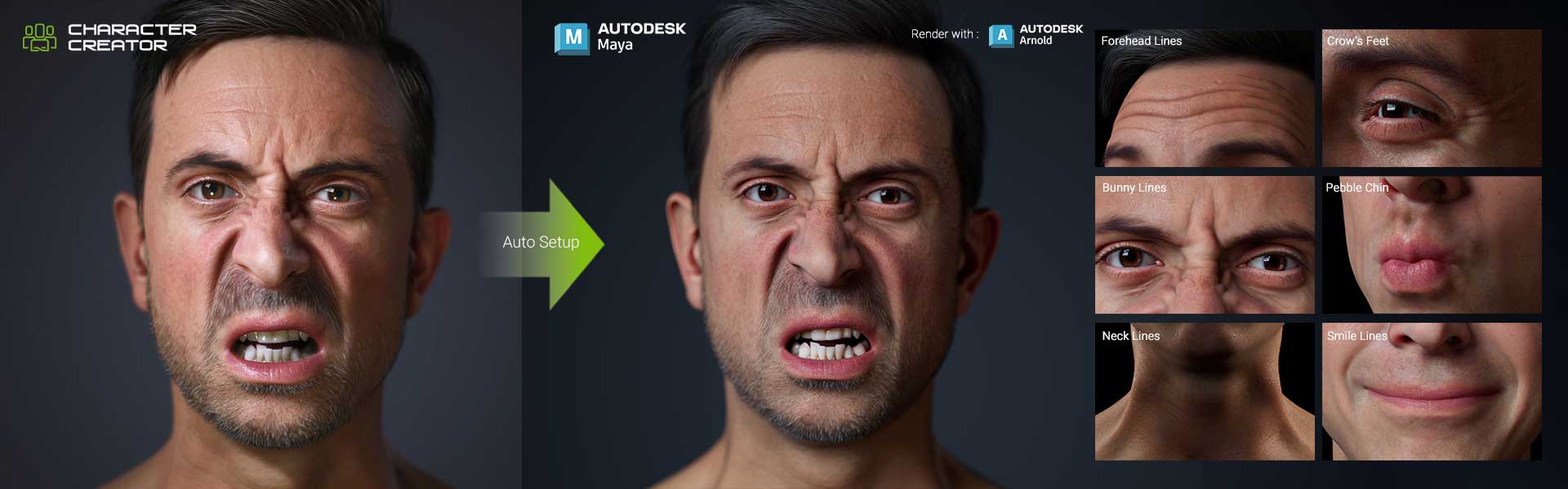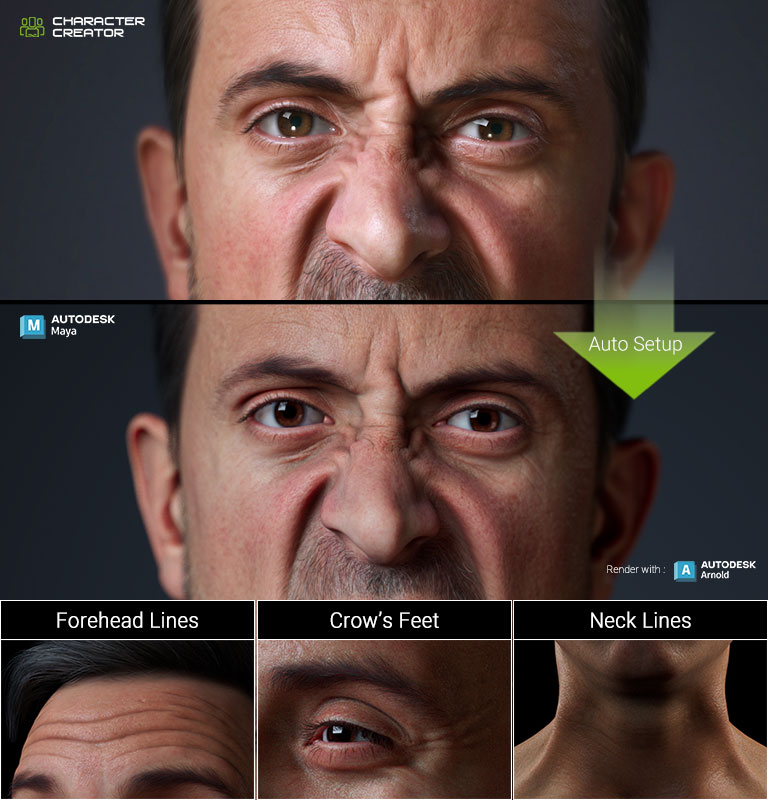 The proprietary Wrinkle system enhances the appearance of CC characters with high-resolution, multi-texture blending. Wrinkles dynamically appear alongside expressions and adhere to regional constraints, achieving believable, true-to-life physiology.