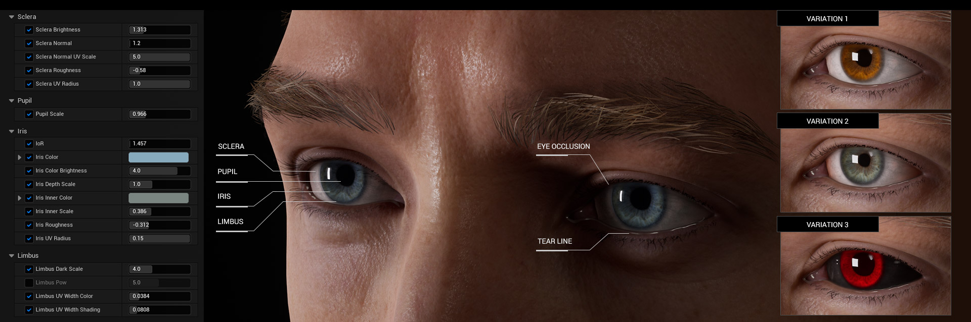 In the Auto Setup 1.24 update, Eye Shader & Eye Occlusion shader blueprints were enhanced to achieve a more realistic look on the eyes. Adjustments were made towards sclera brightness, iris brightness, and eye occlusion shadow.