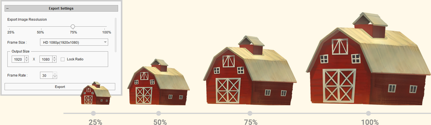 Optional export settings for image resolution, output range and frame rate.