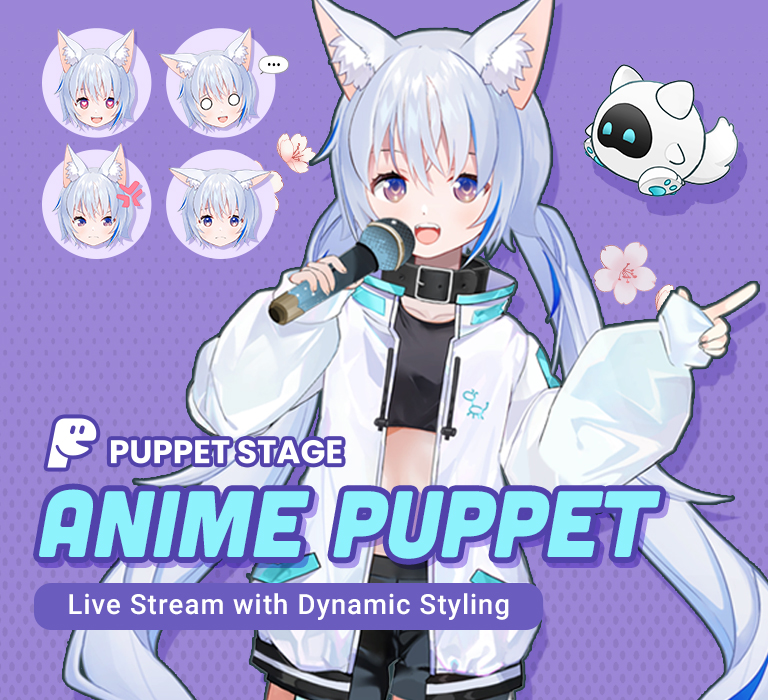 Put on a show with premade motions, facial tracking, VFX, animated props and backgrounds deployed directly onto the Puppet Stage. Trigger multiple animations with communal hotkeys, or adjust image opacity to fade or hide elements.