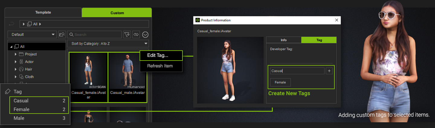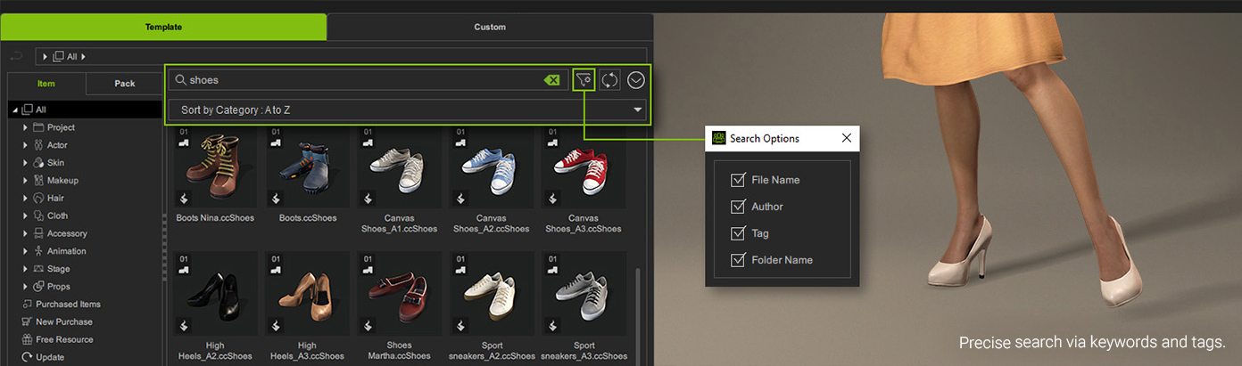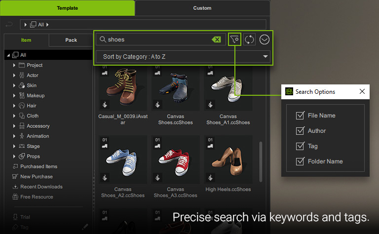 The easiest way to search content of any type is by keywords and tags. Sort content by category and quickly find all items belonging to certain groups. In addition to the official tagging system, Smart Content Manager lets you define custom tags for any item. Locate and retrieve content based on user-defined categories: project, genre, usage, abbreviations, and more. To find more related assets, you can click the Smart Search icon to immediately Search Online content.