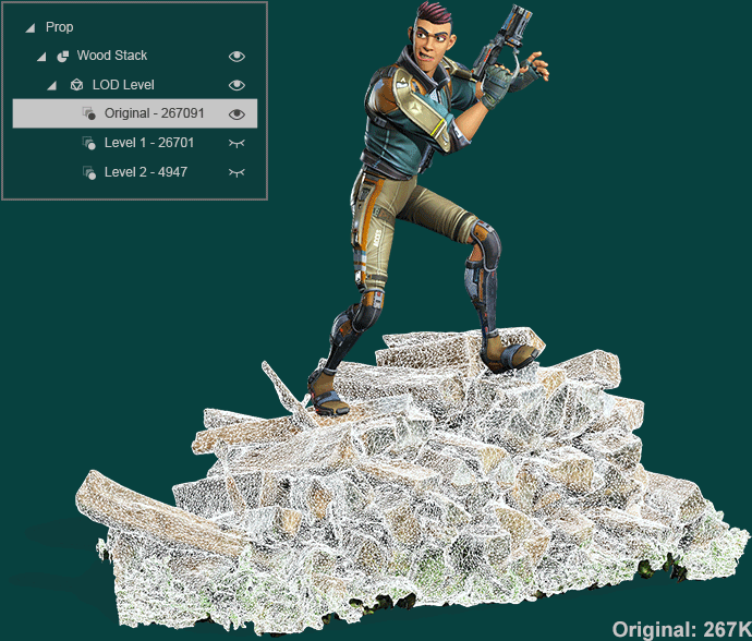 Polygon reduction also works for props with skinning and bone rigs, which gives real-time performance for animating props originally made by high-poly geometries. Generate several levels of detail for the same animated prop.