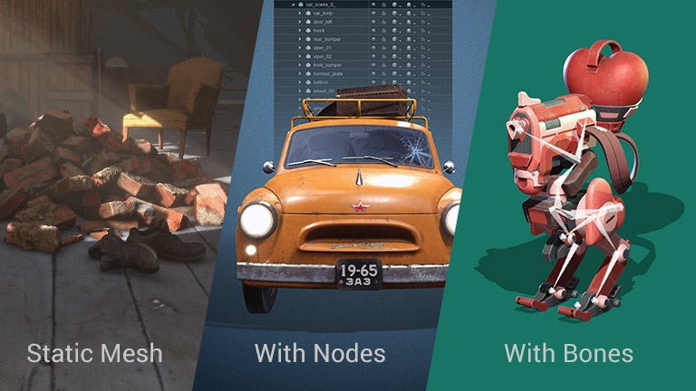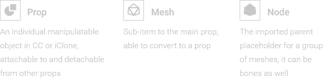 Other than a single piece of mesh, a 3D prop can contain multiple sub-items with node hierarchies, or bone rigs.
