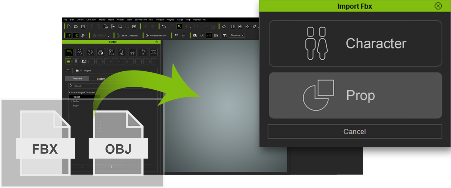Supporting both OBJ and FBX files, dragging in a FBX file will prompt choosing the data type. Non-human objects can also be set as 3D Props.