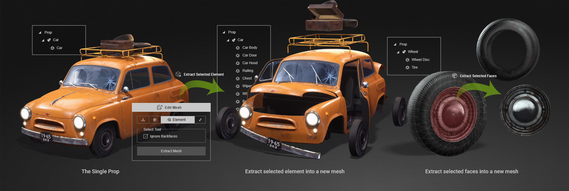 The first step to animate a 3D prop is to well prepare its animatable parts, CC has all the tools to combine mesh elements or separate sub items, also be able to extract items from selected faces, and make them into a new prop.