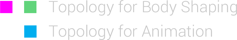 • Color marks on CC3+ topology are designed as feature landmarks for character modelers, ZBrush artists (GoZ), or retopologized character from scan models.