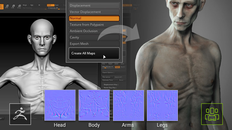 UDIM UV layout enables one-time multi-texture baking in ZBrush.