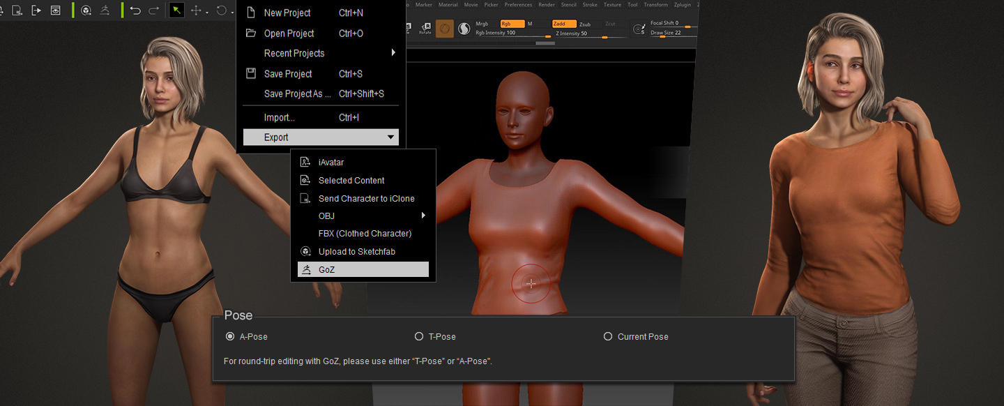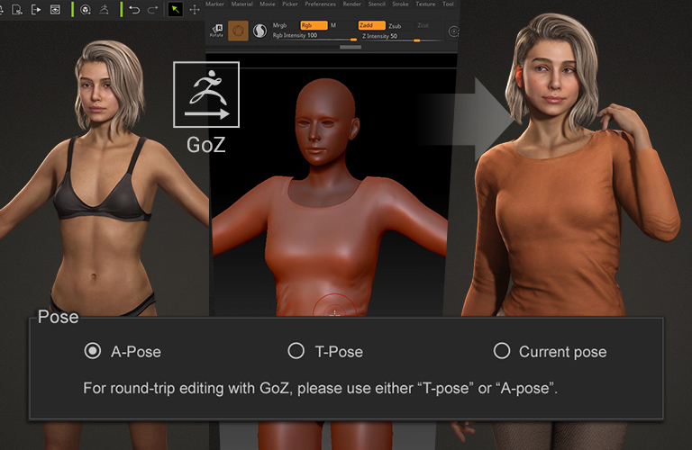 • A-Pose simplifies the process of skinning scanned clothing and seamlessly integrates with ZBrush.