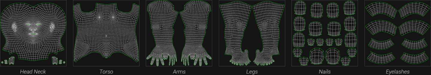 • Expanded UV spaces accommodate close-up details of the face and hands.