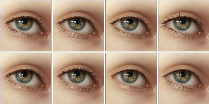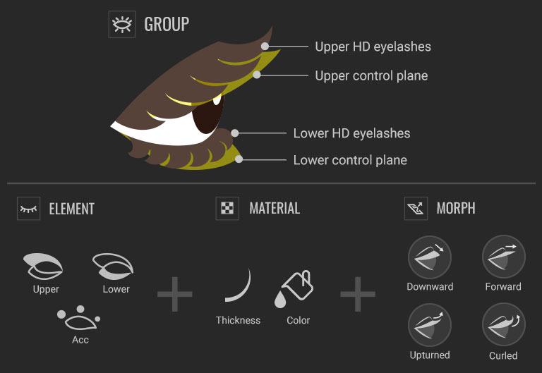 A full set of eyelash morphs lets you shape lashes exactly as you want. Whether straight, downward, upturned, curled, or with varied lengths at the corners, any style is possible.