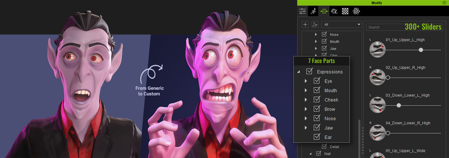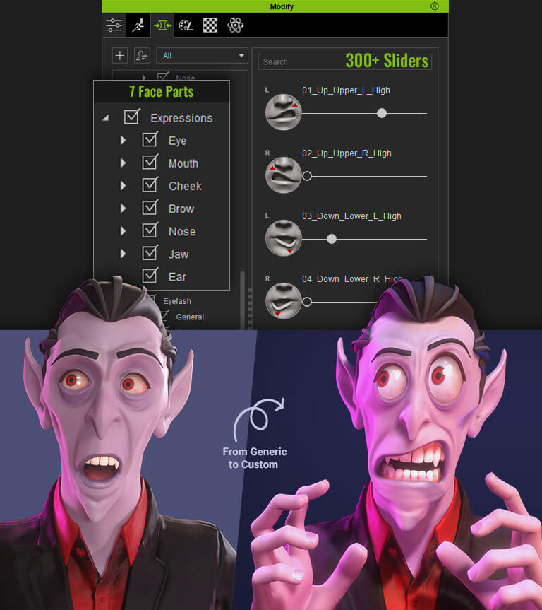 A total of 300+ expression morphs arranged by facial feature categories can be found under Modify - Morphs - Head - Expressions. In the Expression Profile Editor, designers can customize facial expressions directly using those modeling sliders. Learn More