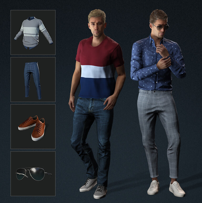 Two super detailed CC4 avatars with Extended Facial Profiles (140+ blendshape) showcasing the new level of facial quality. Kevin, the iconic CC4 character made by 3D Scan model and 4D scan expression blendshapes; and Camila, made by highly-skilled ZBrush sculpting presenting her unique characteristics, each with their own set of wardrobe, hair and brows, and unique facial profiles for face key editing, face puppet, and facial mocap. Enhanced with Dynamic Wrinkle in CC4.2 release.