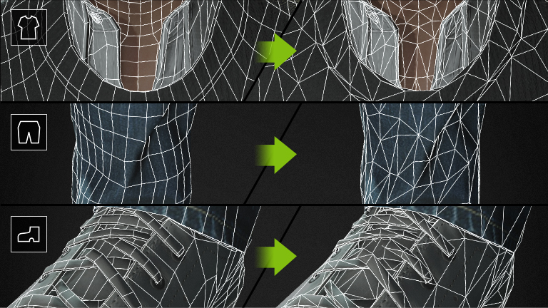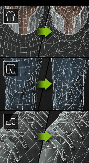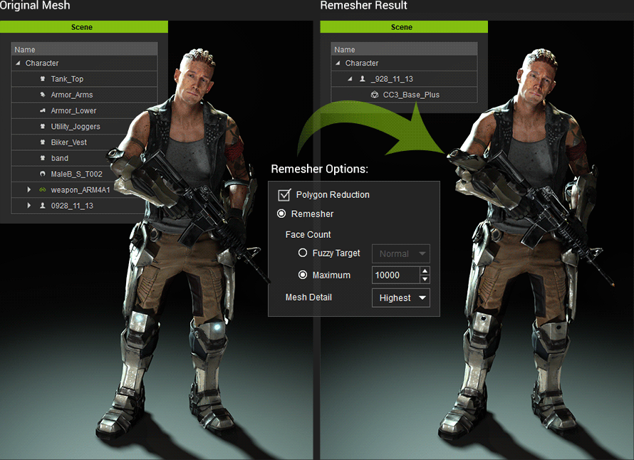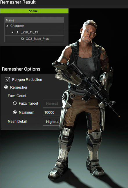 Complete control over the reduction options from one central panel to set bone count, polygon count, texture size, and facial details. Save custom profiles for repetitive conversion processes.