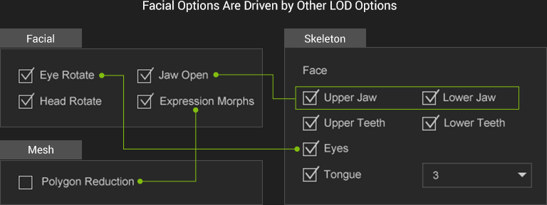 When a character is farther away from the camera, the facial animation data including hundreds of expression morphs and lip shapes become redundant. The Facial Reduction panel allows designers to optionally take out facial blendshapes, teeth and tongue, facial bones for the optimal realtime performance.