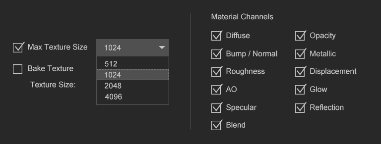 | Texture Size | 4096 multi-channels for 4 body materials | 4096 | 1024 | 512 | |