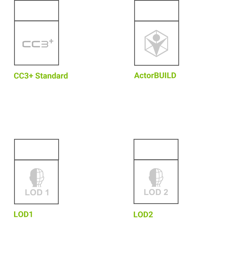 | Character Level | Subdivision Export | CC Avatar(CC3+) | ActorBUILD | LOD 1 | LOD 2 |