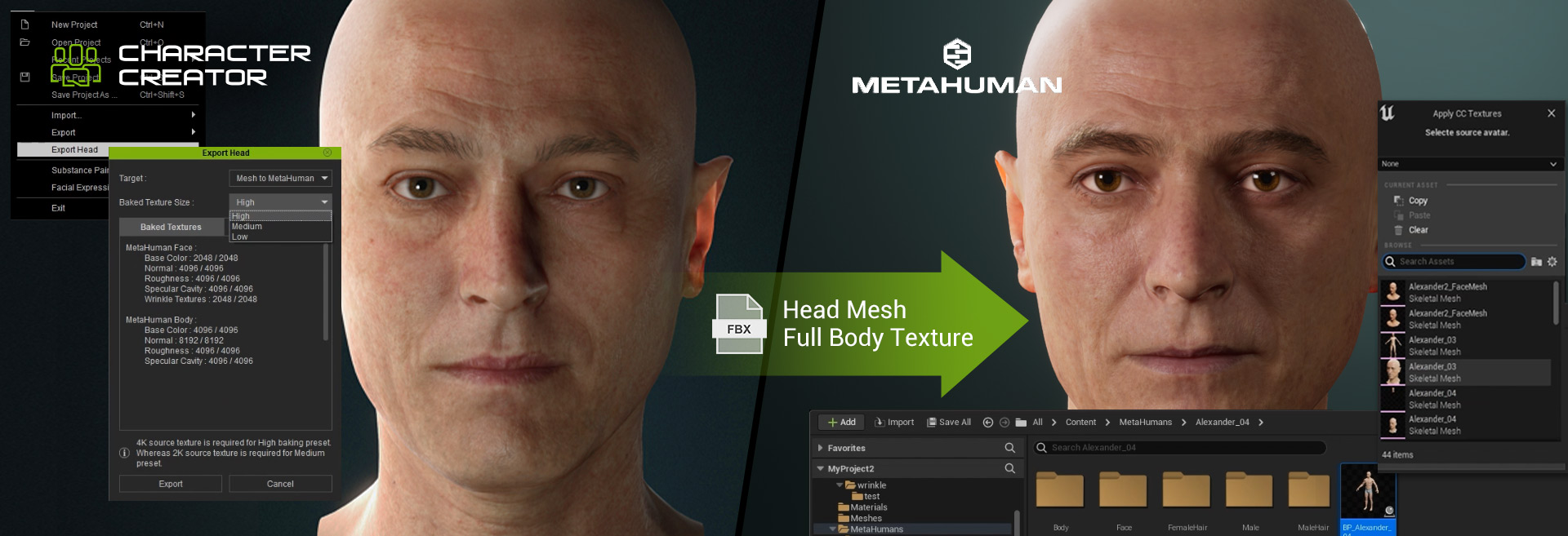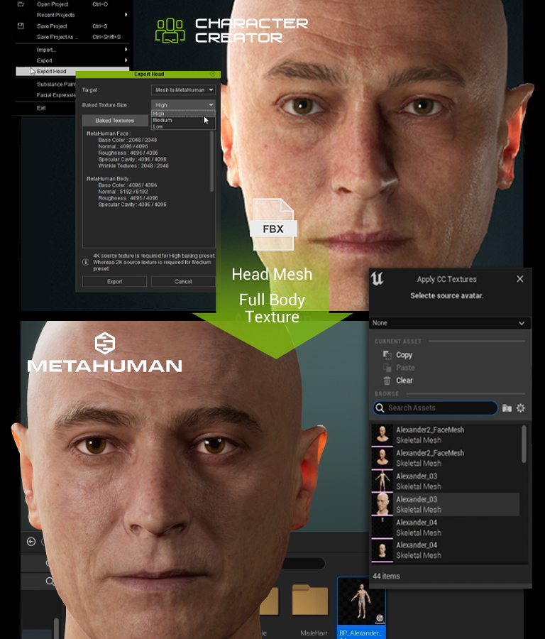 Creating your MetaHuman avatars with realistic features has never been easier, thanks to CC's latest Head Export feature. With just a push of a button, you can effortlessly transfer CC head shapes and 4K head and body textures. Elevate your MetaHumans to a new level of authenticity with CC's unparalleled true-to-life features.