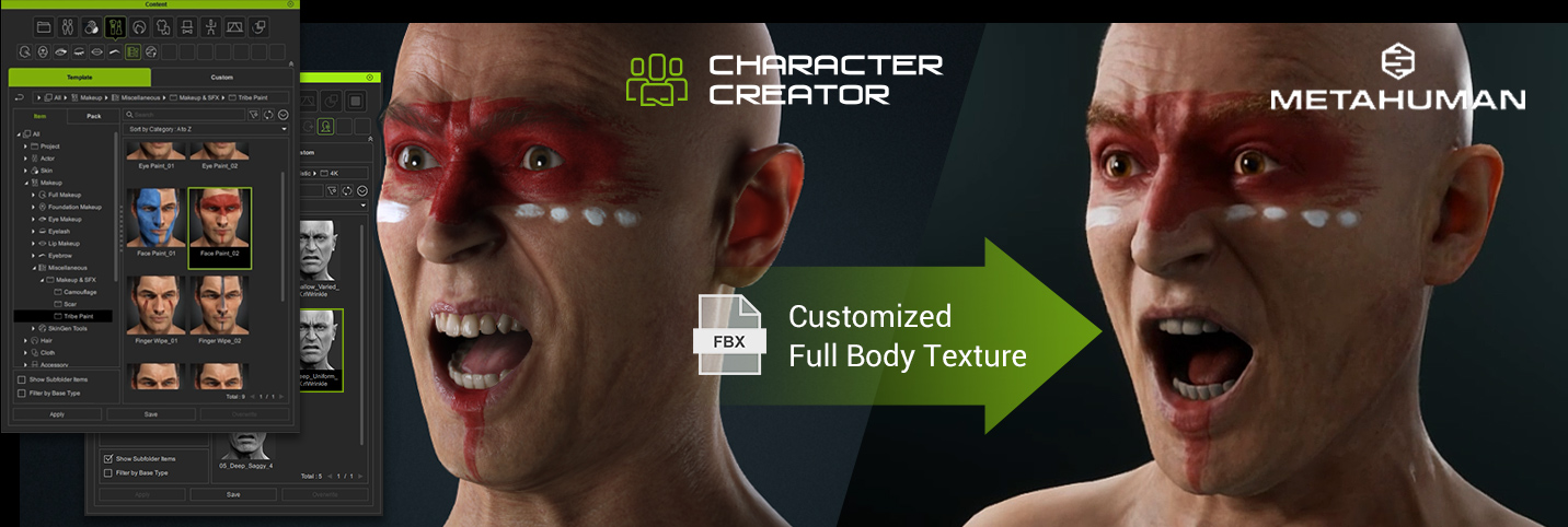 Create unique digital actors with ease using the Character Creator (CC) asset ecosystem. From shaping, skin layer editing, hairstyling, outfiting, to adding accessories, designers can effortlessly bring their vision to life. With CC 4.2 and Auto Setup for Unreal, the new CC-to-Metahuman pipeline allows for seamless transfer of head shape, skin textures, and dynamic wrinkles, delivering ultra-realistic results in Unreal engine. See More of The MetaHuman Pipeline >