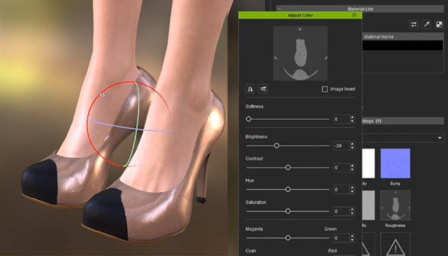 The new Color Adjustment interface unifies all color adjustment parameters in one pop-up panel so that you can multi-select target materials, click on the desired texture channels and instantly modify them. The same interface can effectively help improve PBR roughness and metallic texture adjustments, as well as softness and image inverting.
