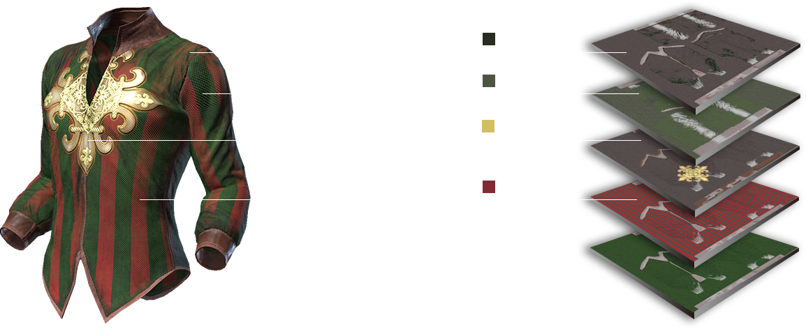 Use Color-ID maps to define clothing for different parts such as; leather in the collar, main body portion tiled with graphics patterns, or the chest area is stitched with a decal logo.