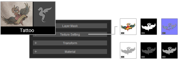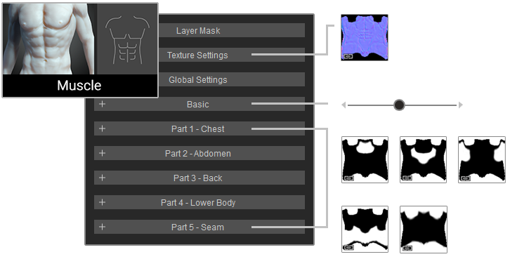 Part Control tool is suitable for applying color differences in large ranges such as suntans. Apply up to three range masks to determine the effective areas, with support for different colors and materials. Normal and Micro-normal effects are also applicable.