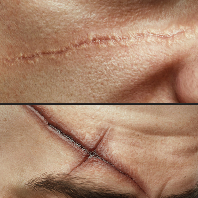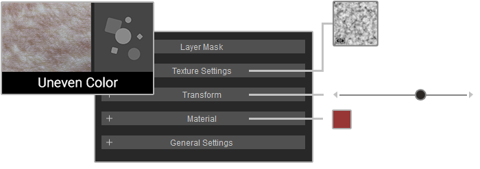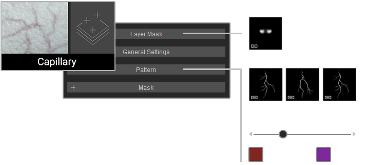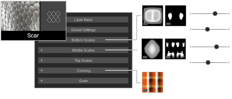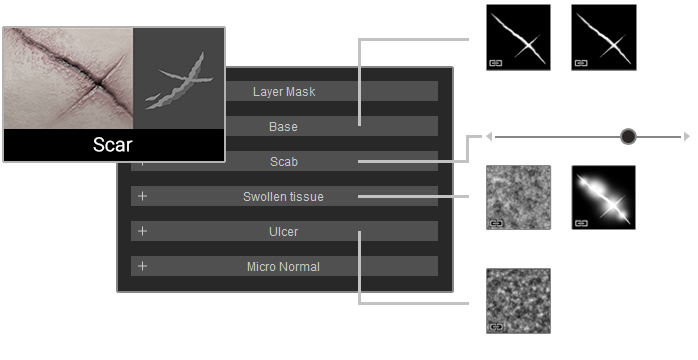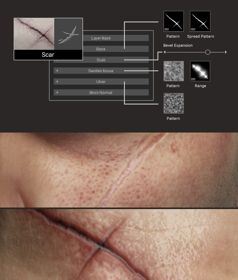Based on real-life scar tissue, there are four parts to the Scar tool: Base, Scab, Swollen Tissue and Ulcer. You can define the scar shape by applying one Alpha range image on the Base layer, and create swollen, ulcer effects by applying an Alpha range image and pattern images on Swollen Tissue and Ulcer. Easily create scars in different stages like a fresh scars, old crusty scabs, and more.