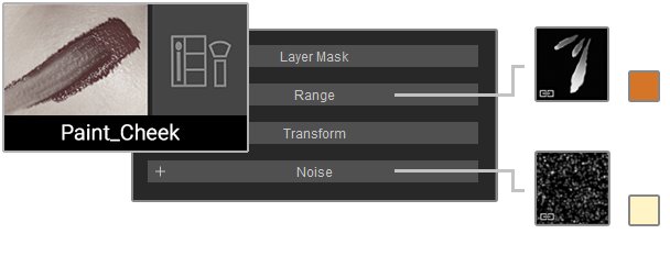 The display area can be defined by one alpha range mask and filled with a color of your choosing. From the Noise section, add a noise pattern to strengthen the normal effect, and use the noise color for a grainy look. Same as the other SkinGen tools, Noise Gray provides a Normal and Material selection which can give it a thickly painted resulted. Foundational makeup, body paint, and even eyeliner can be created with this utility.