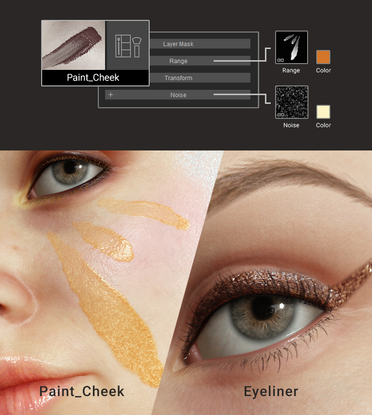 Dream up different looks for the skin or layer on makeup effects -- SkinGen tools are flexible and easily accessible via a consolidated library.