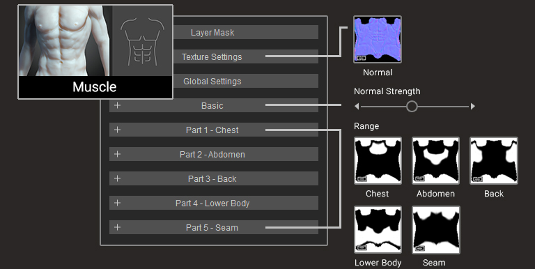 Adjust separate muscle regions with the Part Normal tool. Each area supports different normal intensity levels. The overall normal effect is composed of a master normal map with five separate range masks. With global normal strength adjustments and specific range tuning, one can create muscle, sinew, and wrinkle effects.