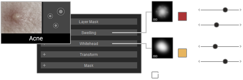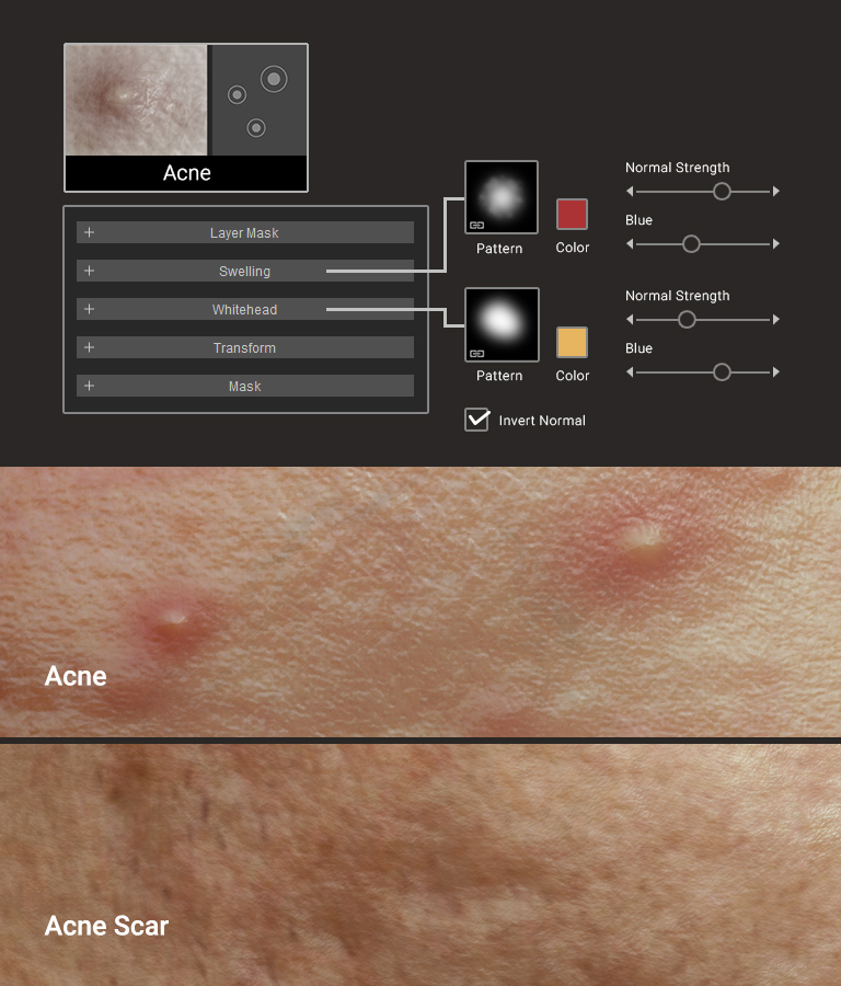 The Acne tool includes the outside layer (Swelling) and inner layer (Whitehead) with support for an alpha pattern for each layer to help create a natural acne effect. Change the colors and normal levels for a finer look. In addition, Invert Normal can be used to create an acne scar effect.