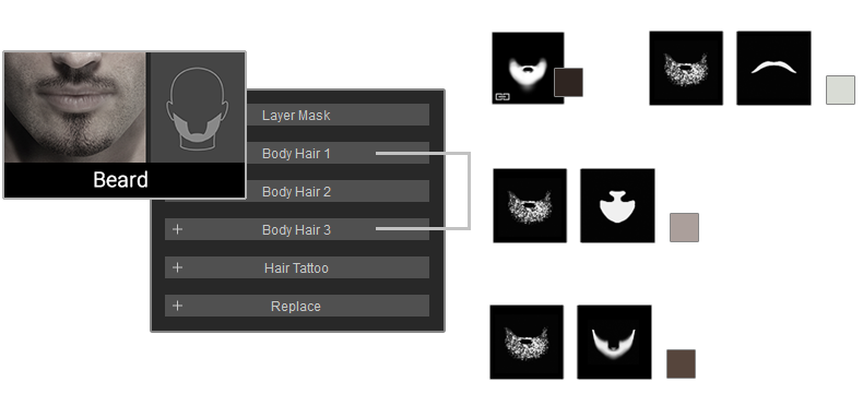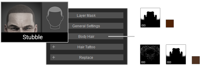 The Body Hair Plus, unlike Body Hair, has three layers, with each one supporting a alpha pattern, a range map for the hair, and a range map for the pores to achieve a shaved look.