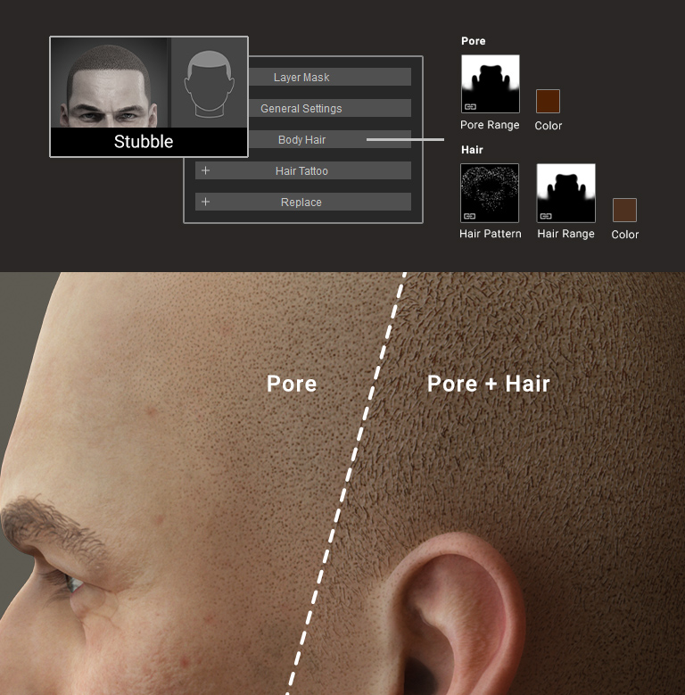 With only one layer, you can define the hair and pore style by applying an alpha pattern and range map for the hair, and one alpha range map for the pores. Access Shaving Pattern to create facial hair of different styles. Use the Body Hair tool to generate hair across different materials, mix and match with the Body Hair Plus tool.